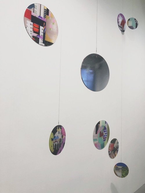 Acrylic disc mobile from photo fragments collected in Berlin, 2019